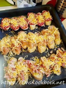 - Bruschetta's zo afbakken op 220 graden: tot ze mooi krokant zijn en de kaas mooi is gesmolten.